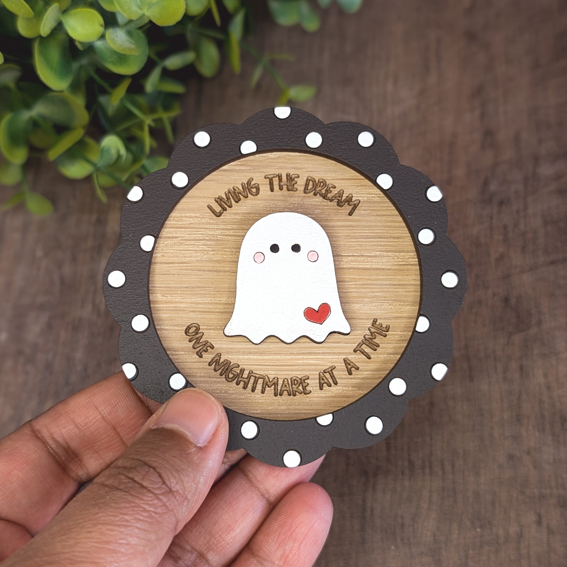 This adorable piece features a cute ghost, set in a round scallop frame with the quote "Living the dream, one nightmare at a time." It's equal parts whimsical, funny, and irresistibly giftable.