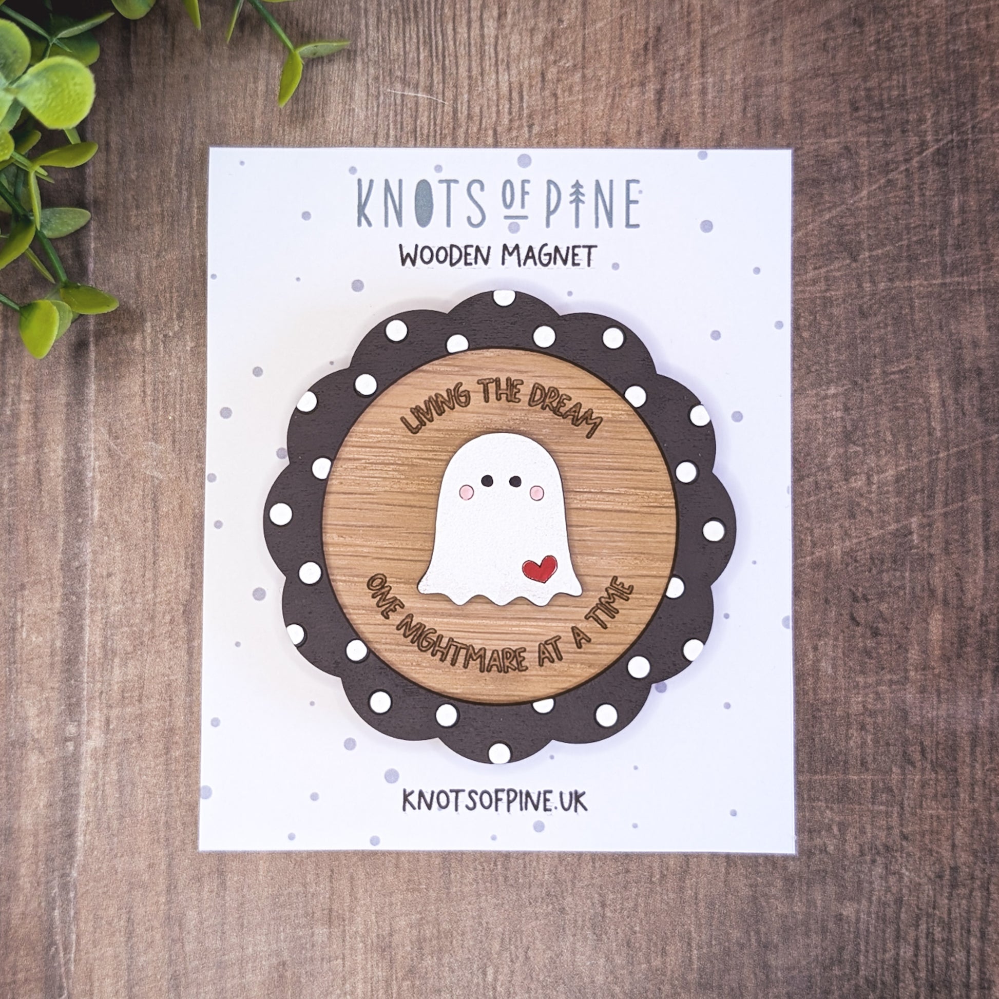 A wooden ghost magnet that brings a little spooky sweetness to any space, all year round.